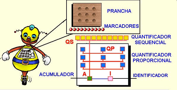Nesse modelo, um identificador I (um circuito neural visual, auditivo, tátil, etc.) identifica o objeto a ser contado. A cada identificação, o elemento I envia um pulso para o acumulador A que muda seu nível de atividade (Fig. 2 – Operando por unidade). Esse acumulador A está conectado a um conjunto de outros neurônios que são chamados de quantificadores. Definiu-se dois grupos de quantificadores: os Quantificadores Proporcionais e os Sequenciais (fig. 1), que podem, por exemplo, controlar as marcas na prancha do robô, mostrando a quantificação realizada.