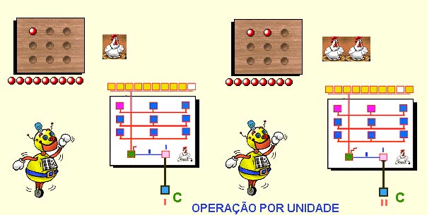 No processo de contar, o robô localiza e aponta um objeto de interesse. Quando isso ocorre, o identificador I aumenta a atividade do neurônio Acumulador A em uma unidade, que por sua vez determina a ativação de um número proporcional do Quantificador Proporcional e um número do Quantificador Seqüencial (fig. 2). Esse processo de contagem é chamado aqui de Contagem por Unidade.