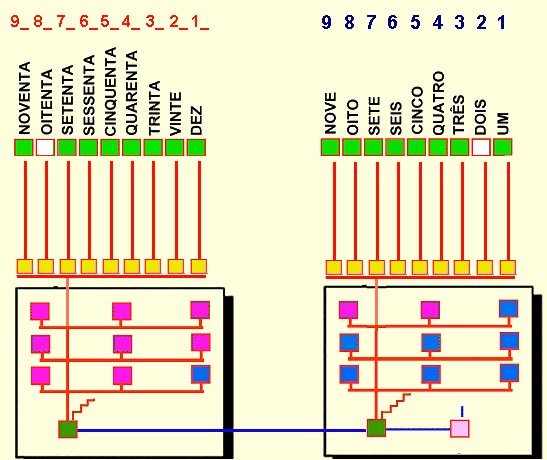 Os circuitos mostrados nas Figs. 1 a 3 são capazes também de suportar as relações entre aritmética e linguagem. Basta os Quantificadores Seqüenciais se relacionarem com os neurônios de controle da fonação para números, localizados na área de Broca, ou com aqueles para reconhecimento das formas visuais dos números arábicos localizados no giro angular (fig. 4). Dessa maneira, somos capazes de codificar as quantidades reconhecidas por esses circuitos tanto na fala quanto na leitura e escrita. Da mesma maneira, os neurônios sensoriais que reconhecem os sons e as imagens dos números podem mapear diretamente os respectivos Quantificadores Seqüenciais.