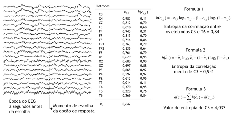 Efetua-se a correlação da atividade elétrica registrada por cada canal com aquela registrada por cada um dos outros 19 canais. Em seguida, realiza-se o cálculo de entropia dessas correlações de maneira que se a correlação entre a atividade registrada por 2 canais tender a 1 ou a 0, o valor de entropia dessa correlação tenderá a 0. Se a correlação tender a 0.5, o valor de correlação tenderá a 1.
