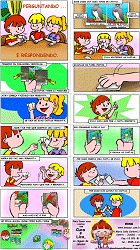 2 manuais ilustrados com instruções para a criança aprender o conteúdo da história brincando. (frente e verso)