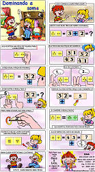 2 historinhas ilustradas com instruções para a criança aprender brincando os algarismos e a soma. (frente e verso)