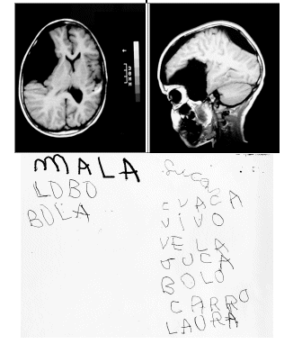 O mais importante é que essas crianças estão agora iniciando seu processo de alfabetização, e mostrando que apesar das suas lesões extensas de hemisfério esquerdo, são capazes de aprender a ler e escrever (Fig. 5).