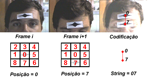 A movimentação será detectada através da codificação da mudança relativa da posição do objeto marcador entre os frames i e i+1 de acordo com a metodologia introduzida por Serapião et al, 1996 e ilustrada na Fig. 1.5.1.1. A posição no frame i será tomada como imagem origem de referência, e a posição do frame i+1 será referenciada à direção padrão mais próxima. Desta maneira podemos comparar a trajetória do marcador e saber a direção do seu movimento. No processo de codificação o sistema retira de cada objeto marcador seu ponto central, que será comparado com a demais imagens, desta forma o sistema ganha em simplicidade e rapidez.
