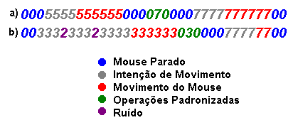 No exemplo da Fig. 1.5.2.1, existem duas cadeias de caracteres que são representadas pela codificação do sistema REMMC. Nas cadeias abaixo o controle 0, significa que o mouse está parado, quando existir qualquer movimento diferente de 0, o sistema inicializa um contador que espera a repetição do mesmo movimento até que atinja um determinado limite a partir desse instante o mouse começa a se movimentar na direção desejada, quando o usuário quiser mudar de direção terá que esperar novamente este ciclo, esta repetição do mesmo movimento é muito importante no sistema porque ajudar a identificar ruídos ou operações padronizadas como mostra a Fig. 1.5.2.1.
