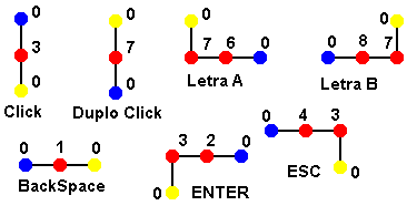 No exemplo acima as bolinhas amarelas simbolizão o início do movimento padronizado e a bolinha azul indica o final da seqüência, e todos os caracteres entre este dois delimitadores representão a simulação da operação pretendida. Neste trabalho realizamos somente testes com a utilização do mouse.