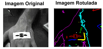 Através de vários testes chegamos à conclusão de que o melhor marcador é aquele que tem a cor preta e impresso em uma etiqueta branca. Com o objeto no centro da etiqueta. Isso facilita bastante a separação dos objetos para a escolha do marcador. A escolha da cor preta se deve ao fato do nível de cinza do marcador preto estar perto de zero e, mesmo que haja alguma variação na luminosidade da imagem ele sempre estará em uma região mais escura que as demais.